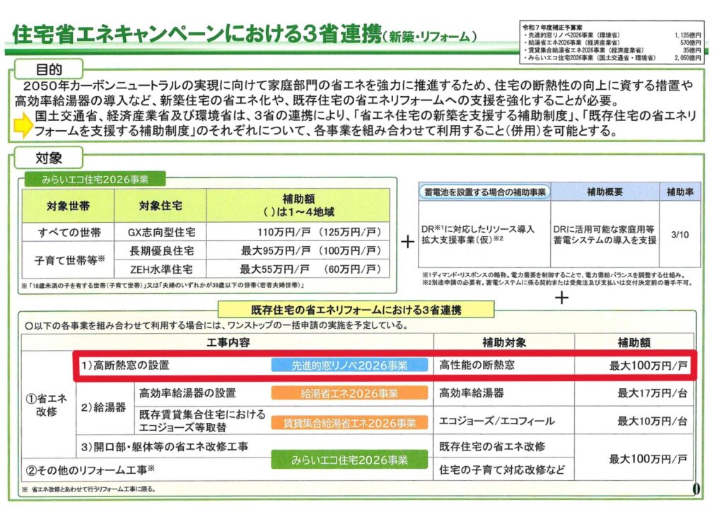 国の省エネ化支援による補助金事業【先進的窓リノベ2026事業】の速報内容が発表されました。