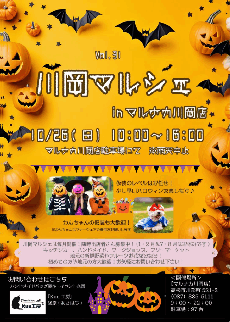 川岡マルシェVol.31へ出店します☆(10月26日(日)) 2025年10月24日2025年10月24日TOPICS ブログ 朝晩は肌寒く日中は涼しい風が心地よい季節になりました🍂野外イベントが楽しめるこの時期✨マルナカ川岡店様でマルシェが開催されます!👏 【川岡マルシェ Vol.31 in マルナカ川岡店】10月26日(日) 10:00~16:00 夏の間お休みだった人気のマルシェが帰ってきました☆当店も久しぶりに参加いたします(^o^)/ハロウィンの愉快な雰囲気の中、みなさまのご来場を心よりお待ちしております!🎃👻 ※雨天中止
