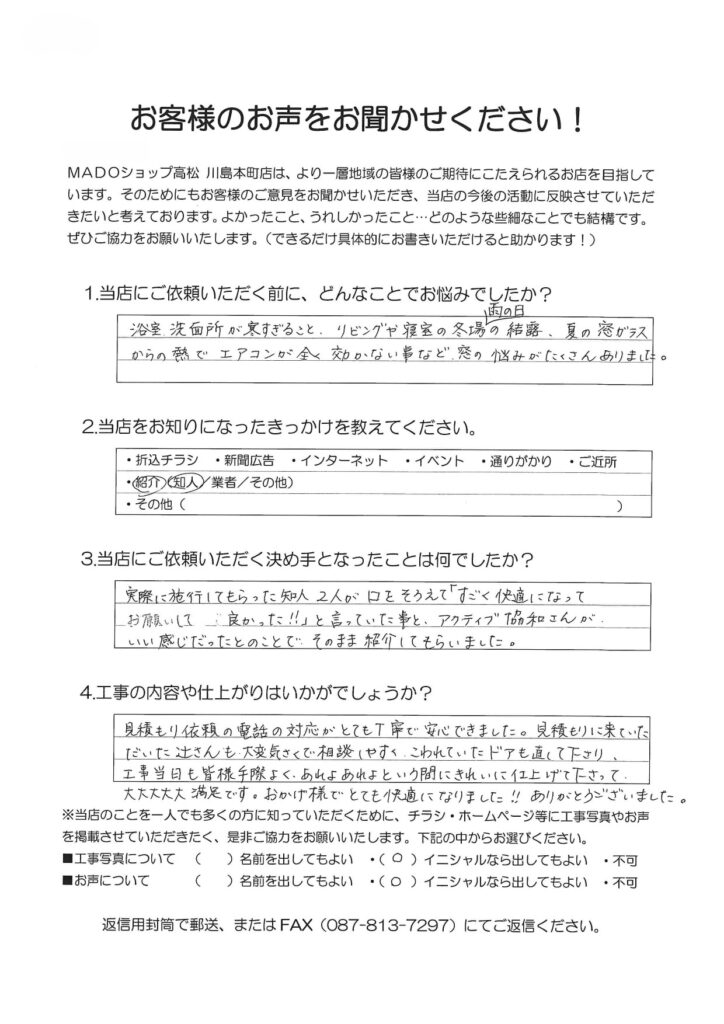 窓に関連する多くのお悩みにお困りでしたが、知人様方が次々と内窓リフォームを行い、その快適ぶりをお聞きしたことで内窓リフォームをご検討されておりました。