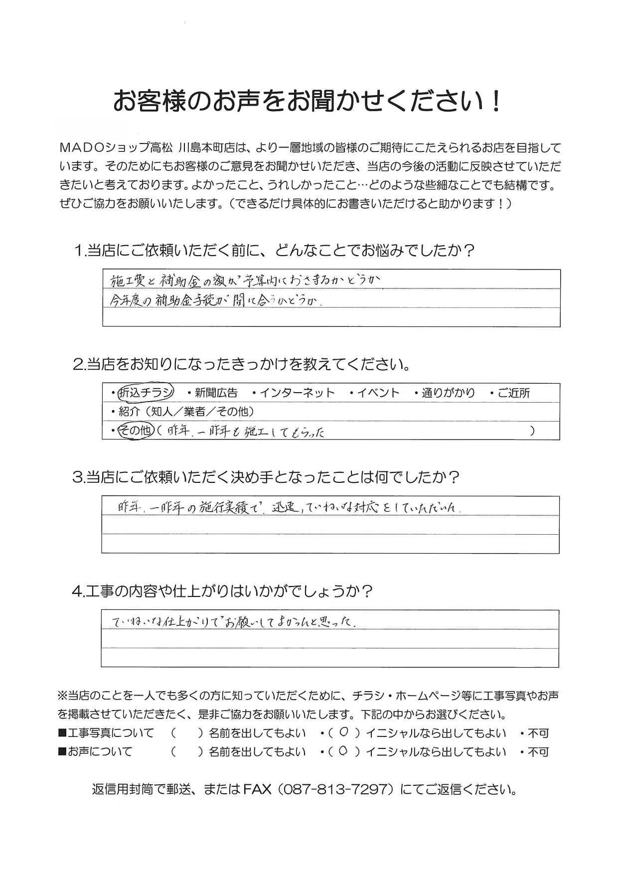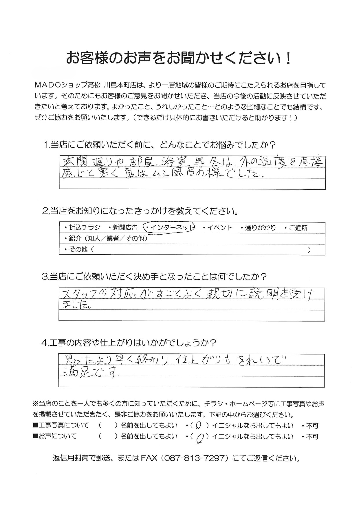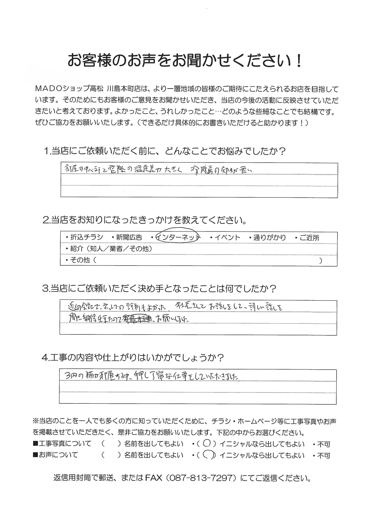 お客様の声 Voice アクティブ協和 | 香川県高松市 > お客様の声 お客さまの声の一部をご紹介いたします。(サムネイル画像クリックで拡大表示します) エクステリア・ガーデン 玄関ドア・窓リフォーム