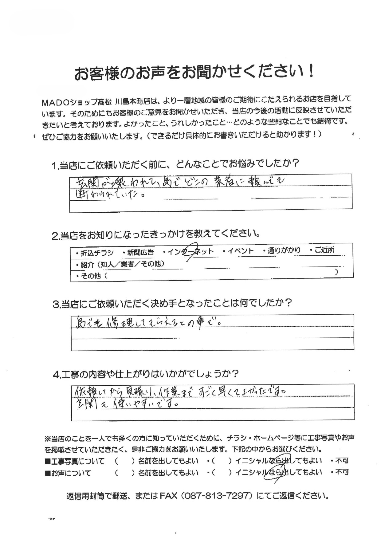 1.どんなことでお悩みでしたか?信頼できるお店であるか。2.当店をお知りになったきっかけを教えてください。折込チラシ3.当店にご依頼いただく決め手となったことは何でしたか?見積りに来てくださった方が良い人だと思ったので。4.工事の内容や仕上がりはいかがでしょうか?すごく満足しています。ありがとうございました。
